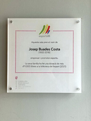 La consejera de Asuntos Sociales y Deportes, Fina Santiago, el director general de Deportes, Carles Gonyalons y las herederas del empresario y promotor deportivo Josep Buades Costa han asistido a la colocación de una placa en homenaje al que fue vicepresidente del Real Mallorca. Josep Buades dio al Centro de Interpretación del Deporte (IEIB) la biblioteca especializada en el deporte que muy cuidadosamente había coleccionado durante dieciséis años.