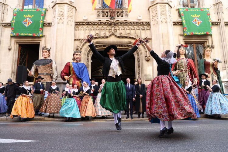 El Consell de Mallorca ha dado inicio a las actividades organizadas para el Dia de les Illes Balears con una muestra de ball de bot multitudinaria y el encuentro de los emblemáticos gigantes que presiden las escaleras del Palau (la reina Esclaramunda de Foix, el rey Jaime II, el rey Sancho I y el rey Jaime III).