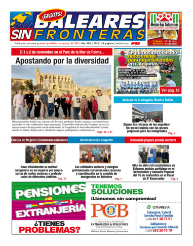 InicioHemeroteca Hemeroteca EDICIÓN BSF 473/22 ANIVERSARIO COMPLETA EN PDF Por BSF 5 de noviembre de 2025 0 36 FacebookTwitterPinterestWhatsApp BSF 473 WEBDescarga Cuota FacebookTwitterPinterestWhatsApp Artículo anteriorEstampaciones Magenta, estrena su nueva sede con una gran inauguración, de la mano de Marcelo, Verónica y MicaelaArtículo siguienteEditorial 473: Qué diferente sería todo si la realidad se mirara desde diferentes prismas BSF NOTICIAS RELACIONADAS Gente Activa Entidades sociales reclaman más recursos y coordinación en la acogida de inmigrantes en Baleares Gente Activa El retraso de los expedientes en extranjería y los graves perjuicios para los inmigrantes Actualidad Entrevista con el cónsul de Ecuador: Más de siete mil ecuatorianos de Baleares podrán participaren el referéndum del próximo 16 de noviembre DEJA UNA RESPUESTA Cancelar respuesta Comentario: Por favor ingrese su comentario! Nombre:* Por favor ingrese su nombre aquí Correo electrónico:* ¡Has introducido una dirección de correo electrónico incorrecta! Por favor ingrese su dirección de correo electrónico aquí Sitio web: Guardar mi nombre, correo electrónico y sitio web en este navegador la próxima vez que comente. 7,465FansMe gusta1,254SeguidoresSeguir373SeguidoresSeguir526SuscriptoresSuscribirte Últimas Noticias Gente Activa Entidades sociales reclaman más recursos y coordinación en la acogida de inmigrantes en Baleares Gente Activa El retraso de los expedientes en extranjería y los graves perjuicios para los inmigrantes Actualidad Entrevista con el cónsul de Ecuador: Más de siete mil ecuatorianos de Baleares podrán participaren el referéndum del próximo 16 de noviembre Editorial Editorial 473: Qué diferente sería todo si la realidad se mirara desde diferentes prismas Actualidad Estampaciones Magenta, estrena su nueva sede con una gran inauguración, de la mano de Marcelo, Verónica y Micaela Cargar más