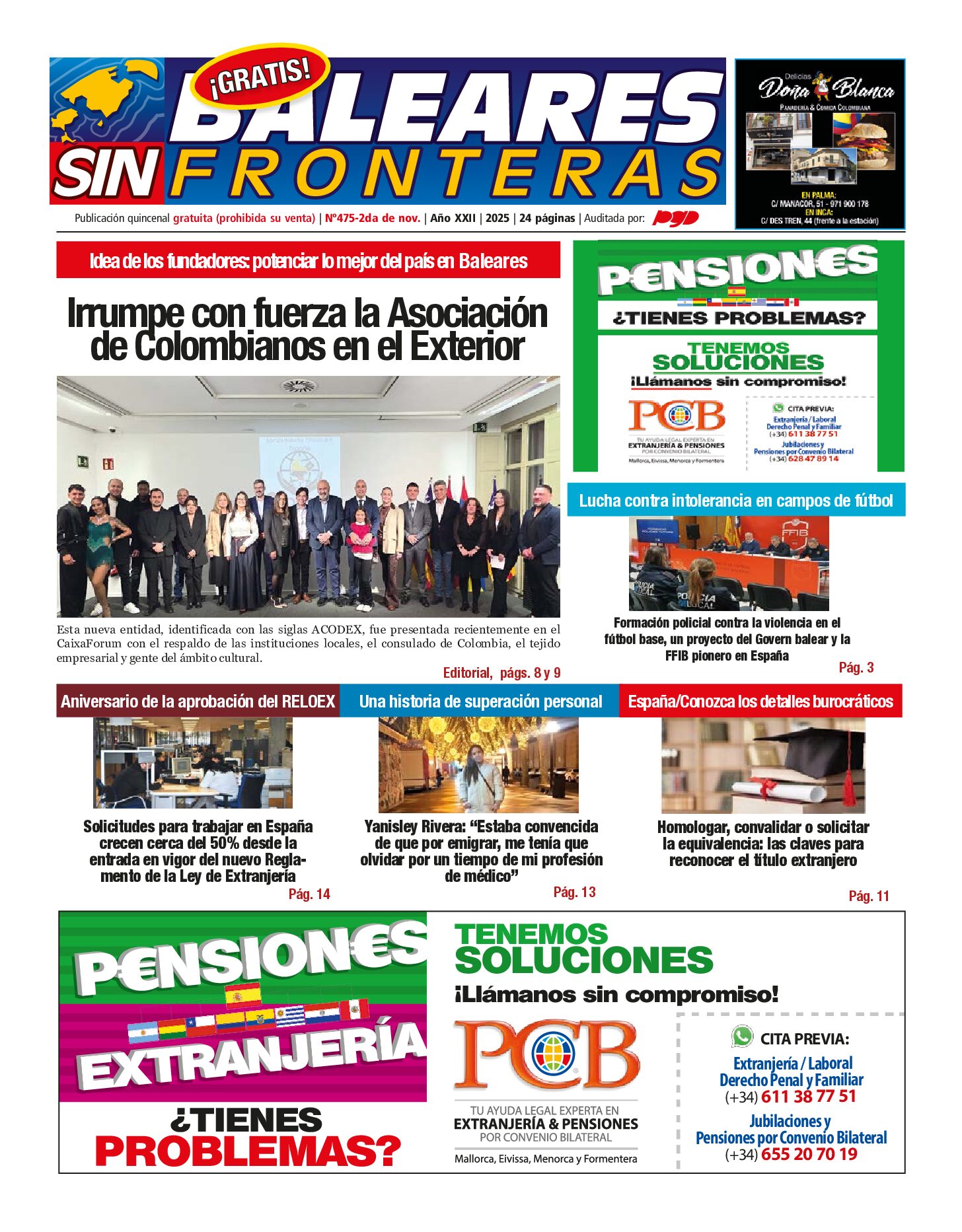 InicioHemeroteca Hemeroteca Edición 475 en formato pdf Por BSF 1 de diciembre de 2025 0 12 FacebookTwitterPinterestWhatsApp BSF 475 WEBDescarga Cuota FacebookTwitterPinterestWhatsApp Artículo anteriorEditorial 475: El resurgimiento del asociacionismo inmigrante en las IslasArtículo siguienteYanisley Rivera:“Estaba convencida de que por emigrar, me tenía que olvidar por un tiempo de mi profesión de médico” BSF NOTICIAS RELACIONADAS Actualidad Yanisley Rivera:“Estaba convencida de que por emigrar, me tenía que olvidar por un tiempo de mi profesión de médico” Editorial Editorial 475: El resurgimiento del asociacionismo inmigrante en las Islas Actualidad Artesanía, gastronomía y presentaciones musicales en el festejo del veintidós aniversario de Baleares Sin Fronteras. 7,465FansMe gusta1,254SeguidoresSeguir373SeguidoresSeguir526SuscriptoresSuscribirte Últimas Noticias Actualidad Yanisley Rivera:“Estaba convencida de que por emigrar, me tenía que olvidar por un tiempo de mi profesión de médico” Editorial Editorial 475: El resurgimiento del asociacionismo inmigrante en las Islas Actualidad Artesanía, gastronomía y presentaciones musicales en el festejo del veintidós aniversario de Baleares Sin Fronteras. Hemeroteca EDICIÓN 474 COMPLETA EN FORMATO PDF (https://www.baleares-sinfronteras.com/wp-content/uploads/2025/11/BSF-474-WEB.pdf) Editorial EDITORIAL 474: La humanización de los consulados, más que un deber es una obligación. Cargar más