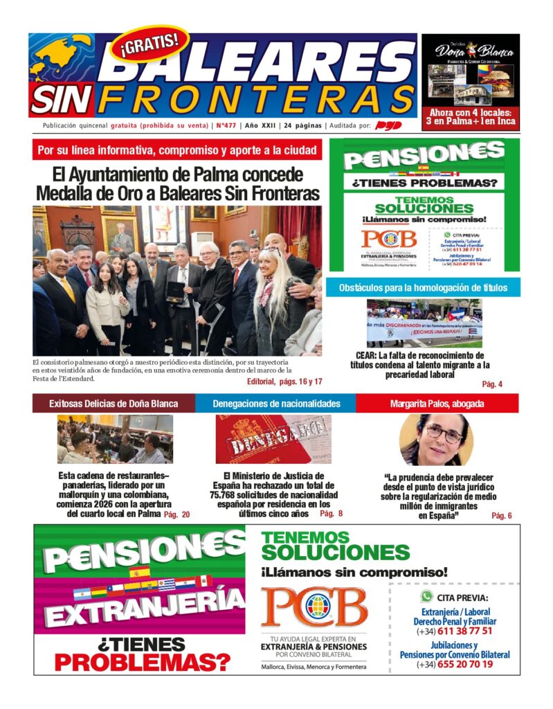 InicioHemeroteca Hemeroteca Edición 477 completa en formato .pdf para descargar Por BSF 29 de enero de 2026 0 41 FacebookTwitterPinterestWhatsApp BSF 477 WEBDescarga Cuota FacebookTwitterPinterestWhatsApp Artículo anterior“Si Bastasen un Par de Canciones”: Un Concierto cargado de homenajeando a Sergio Dalma, Alejandro Sanz, Eros Ramazzotti y Miguel BoséArtículo siguienteEditorial 477 / Gracias al Ayuntamiento de Palma por nuestra Medalla de Oro BSF NOTICIAS RELACIONADAS Actualidad Detalles del borrador sobre el nuevo proceso de regularización de inmigrantes Editorial Editorial 477 / Gracias al Ayuntamiento de Palma por nuestra Medalla de Oro Actualidad “Si Bastasen un Par de Canciones”: Un Concierto cargado de homenajeando a Sergio Dalma, Alejandro Sanz, Eros Ramazzotti y Miguel Bosé 7,465FansMe gusta1,254SeguidoresSeguir373SeguidoresSeguir526SuscriptoresSuscribirte Últimas Noticias Actualidad Detalles del borrador sobre el nuevo proceso de regularización de inmigrantes Editorial Editorial 477 / Gracias al Ayuntamiento de Palma por nuestra Medalla de Oro Actualidad “Si Bastasen un Par de Canciones”: Un Concierto cargado de homenajeando a Sergio Dalma, Alejandro Sanz, Eros Ramazzotti y Miguel Bosé Actualidad Baleares Sin Fronteras recibirá este 31 de diciembre la Medalla de Oro de la Ciudad otorgada por el Ayuntamiento de Palma Editorial EDITORIAL 476: “El lugar de origen no nos hace buenos o malos” Cargar más
