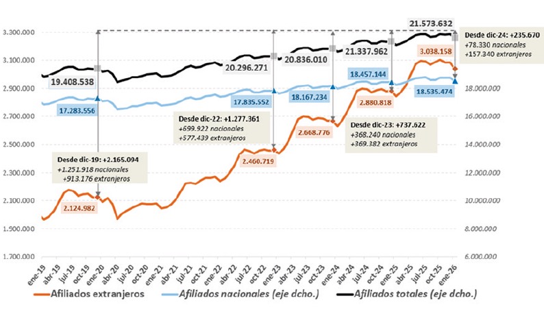 La Seguridad Social registró en enero 3.038.158 afiliados extranjeros en la serie original, tras sumar 195.129 afiliados en los últimos 12 meses y alrededor de 800.000, respecto a enero de 2022, con la reforma laboral ya vigente. En términos intermensuales, la Seguridad Social registra 47.319 ocupados menos, en línea con la tendencia de los meses de enero. En el conjunto del sistema, los trabajadores foráneos representan ya el 14,1% del total de cotizantes a la Seguridad Social, seis décimas más que hace un año. Si descontamos la estacionalidad y el efecto calendario, en el último mes, el número de personas ocupadas procedentes de otros países aumentó en 23.309, hasta situarse en 3.158.890 afiliados. ““El año 2026 comieza con másn de tres millones de afiliados a la Seguridad Social nacidos en otros países.y del futuro de nuestro país”, ha señalado la ministra de Inclusión, Seguridad Social y Migraciones, Elma Saiz. Los trabajadores venezolanos, el colectivo que más crece Del total de afiliados extranjeros, 3.038.158, cerca de 1,7 millones son hombres, mientras que el número de mujeres se sitúa en casi 1,3 millones. La presencia de mujeres trabajadoras procedentes de otros países representa el 42,6% del total de trabajadores foráneos. Alrededor del 30% de las personas afiliadas extranjeras procede de países de la Unión Europea. Entre las distintas nacionalidades, los trabajadores procedentes de Venezuela son el colectivo que más crece en el último año, 34.651 afiliados más que el año anterior (+19,7%). Les siguen las personas procedentes de Colombia, con 28.890 afiliados más (+13,3%) y Marruecos, con un aumento de 26.396 trabajadores (+7,7%). Por otra par t e , Marruecos es el país del que procede el mayor colectivo de afiliados a la Seguridad Social, con 369.584 cotizantes, seguido de Rumanía (331.107), Colombia (245.960), Venezuela (210.984), Italia (201.477), China (126.907), Perú (99.459) y Ucrania (77.770). Régimen General de la Seguridad Social La aportación de los trabajadores extranjeros resulta especialmente relevante en algunos sectores del Régimen General de la Seguridad Social. En Hostelería representan el 28,9% de los afiliados; en Agricultura, el 26,4%; en Construcción suponen el 23,5%; en Transporte, el 17,6%; y en Actividades Administrativas, el 17,4%. Junto a estos sectores, continúa aumentando la presencia de trabajadores extranjeros en sectores de mayor cualificación como Telecomunicaciones y Programación Informática (13,7%); Actividades Científicas y Técnicas (10,4%) y Actividades Financieras (5,6%). Emprendimiento en sectores de alta cualificación El crecimiento de la afiliación extranjera es especialmente significativo en el trabajo por cuenta propia, que en enero se sitúa en 496.330 trabajadores, un 6,2% más que en 2025. Hay que señalar la presencia creciente de trabajadores extranjeros que emprenden en sectores altamente cualificados como Telecomunicaciones y Programación Informática, donde son el 30,8% del total de afiliados. Hostelería (25%), Actividades Inmobiliarias (19%), Actividades Administrativas y Construcción (ambas con 17,6%), son las actividades que reflejan mayor presencia de trabajadores por cuenta propia. Información adicional en la web de Bases de Datos Estadísticas de la Tesorería General de la Seguridad Social.